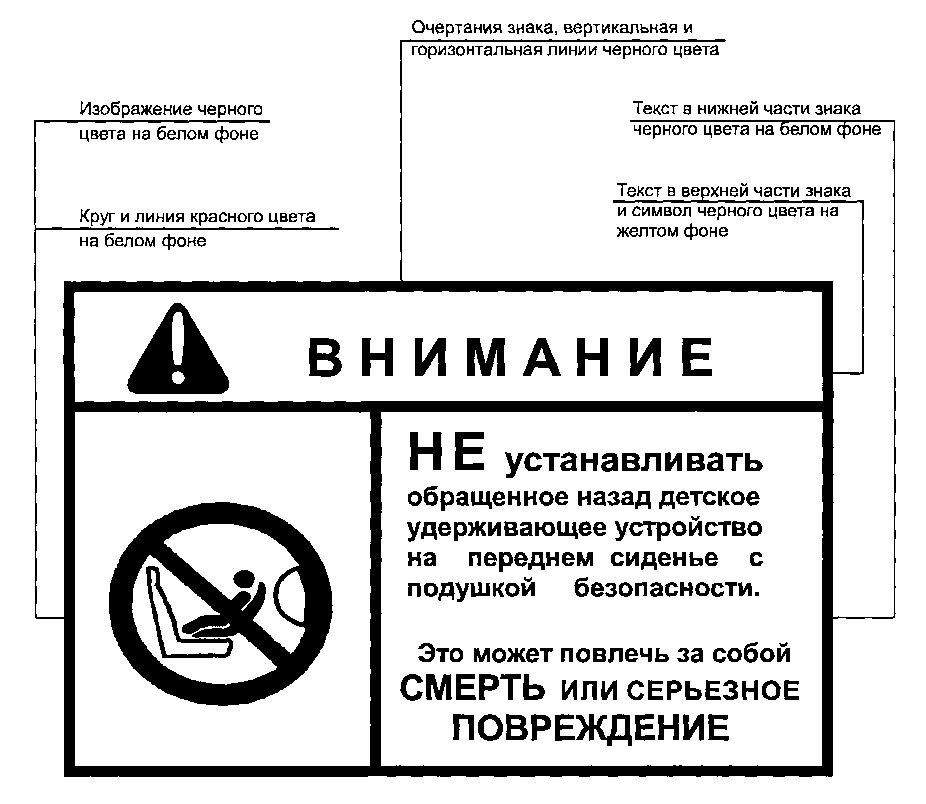 Кроме того, для обращенных назад детских удерживающих устройств в непосредственной близости от места, где в устройстве находится голова ребенка, и на видимой поверхности устройства должен быть стационарно прикреплен предупредительный знак с минимальной текстовой информацией.