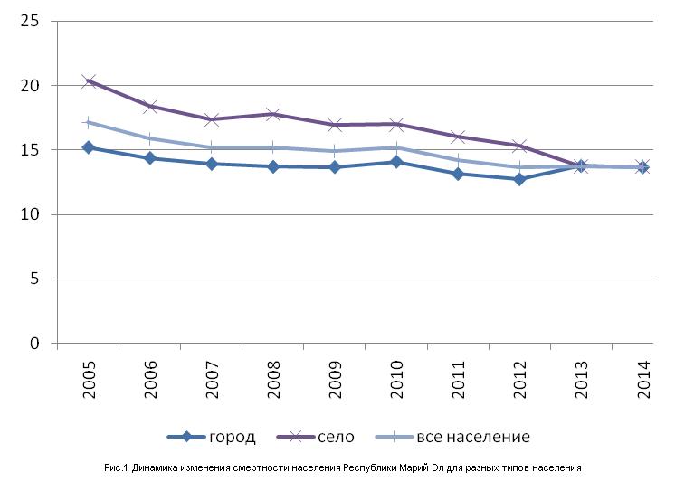 На протяжении 10 лет показатель смертности в Республике Марий Эл имеет тенденцию к снижению (табл. 1, рис. 1).