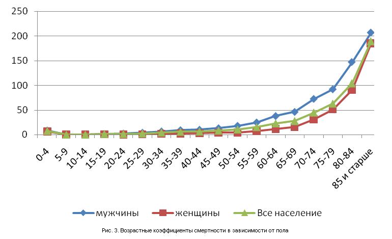 Анализ поло-возрастной структуры смертности населения производился на основе расчета показателей смертности в разрезе пола и возраста по Республике Марий Эл за 2013 год (табл. 3, рис. 3).