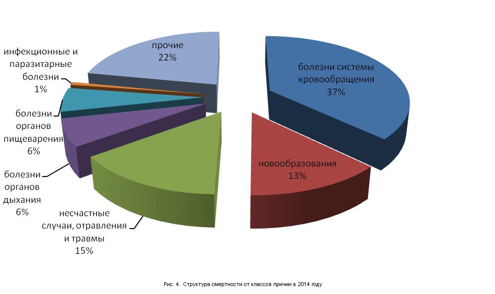 На основании рассчитанных коэффициентов смертности видно, что наибольший вклад в общий уровень смертности вносят классы «болезни системы кровообращения», «несчастные случаи, отравления и травмы» и «новообразования» (рис. 4).