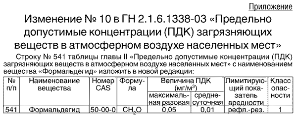 Вместе с тем величина предельно допустимых норм формальдегидов в воздухе увеличена. Теперь максимальная разовая величина ПДК соответствует 0,05 мг/м3 и среднесуточная – 0,01 мг/м3 взамен ранее действующим 0,035 мг/м3 и 0,003 мг/м3 соответственно.